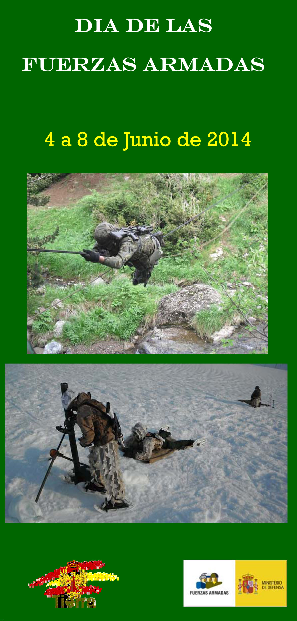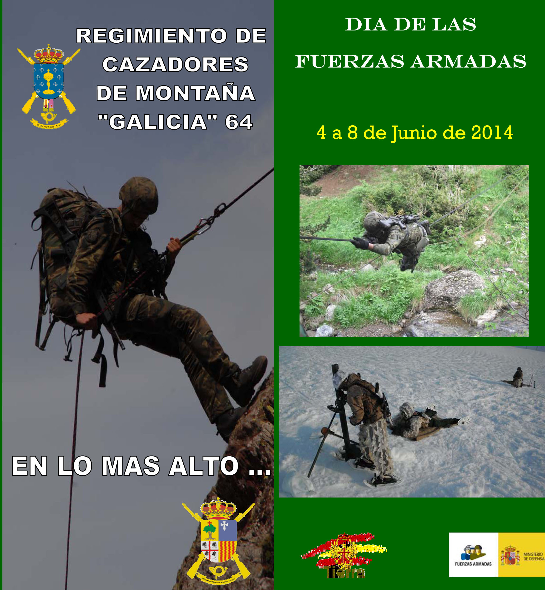 El dia de Las Fuerzas Armadas se celebrara este año 2014 el dia 8 de Junio. El Regimiento de Cazadores de Montaña Galicia 64 ha programado una serie de actos que veremos a continuación en los siguientes carteles.