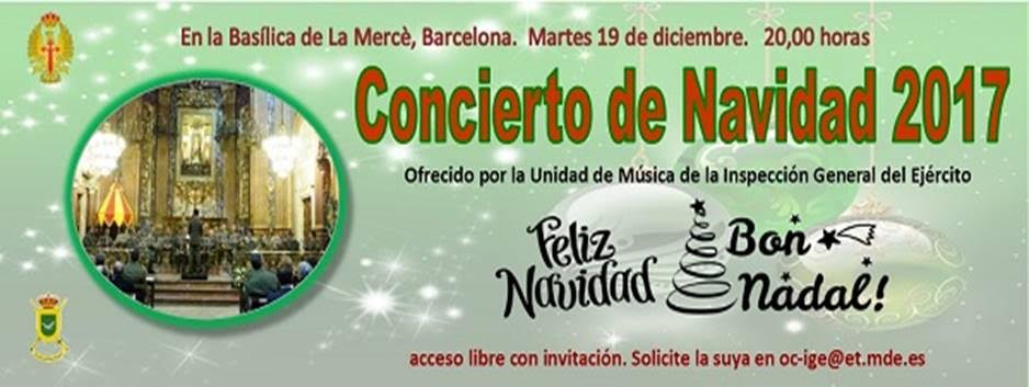La INSPECCIÓN GENERAL DEL EJÉRCITO organiza, como es costumbre en estas fechas, el tradicional Concierto de Navidad, que tendrán lugar el próximo martes día 19 diciembre en la Iglesia Basílica de La Merced, Patrona de Barcelona. Pudiendo asistir libremente todo el que lo desee, previa solicitud de la correspondiente invitación en las oficinas de la propia I.G.E.
