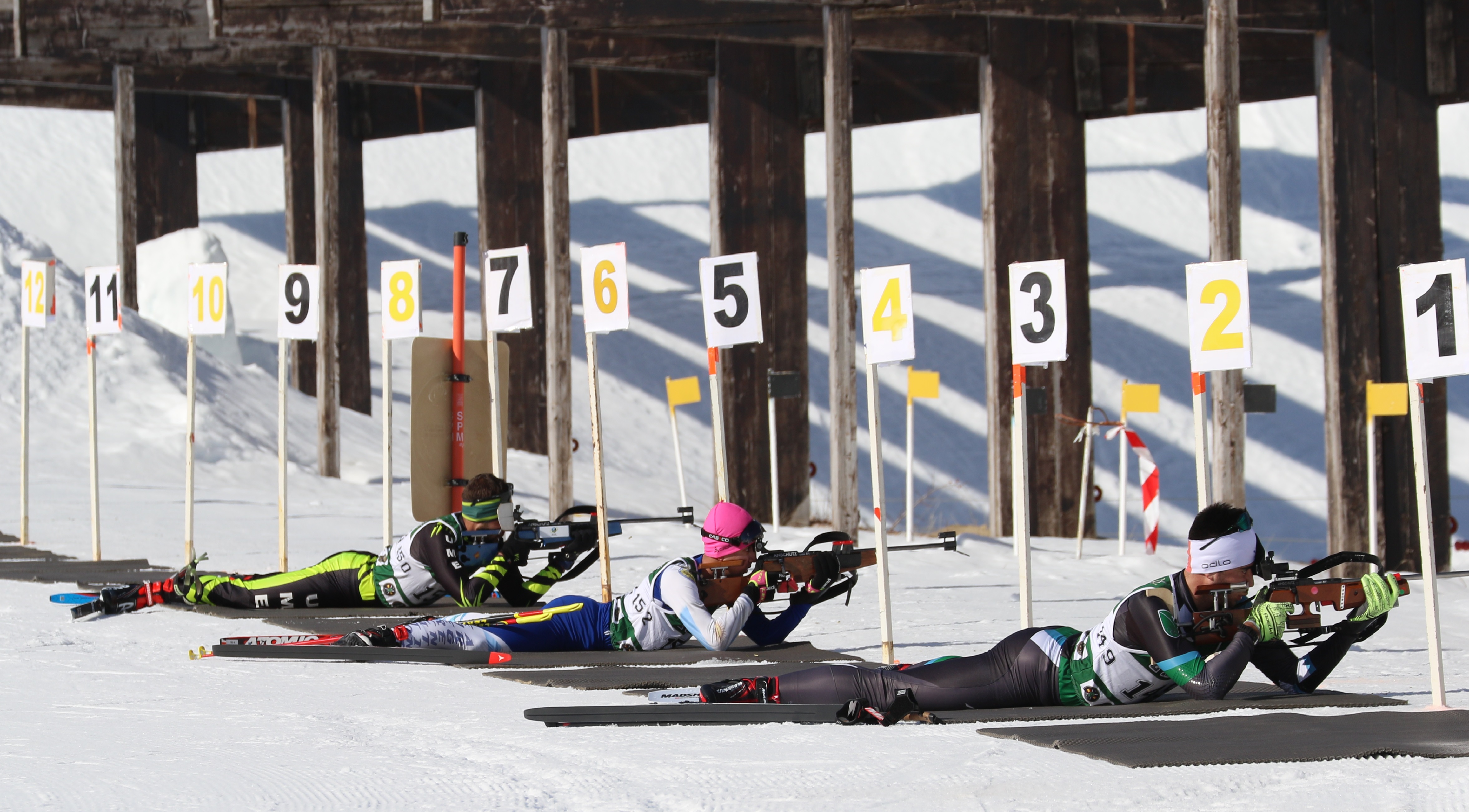 La prueba de biathlon sprint disputada hoy, ha consistido en un recorrido de fondo de 10 km para hombres y 7,5 para damas en técnica libre y desnivel aproximado de 200 m., y una prueba de tiro con 2 entradas en el campo de tiro y 5 disparos por tirada, sobre un blanco de diámetro de 4’5 cm. para la posición de tendido y de 11 cm para el tiro en pie. Se penaliza por blanco no abatido con una vuelta de 150 m al circuito.