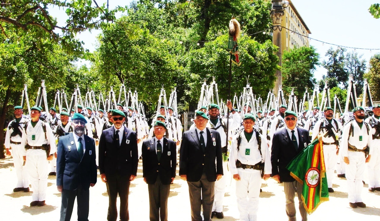 Llegamos a la confluencia de los Paseos de Colón y Delicias, lugar donde se dislocó el desfile, continuamos hasta el Parque de Mª Luisa donde dejamos el Aníbal despidiéndonos de nuestro conductor el soldado Carmona. Seguidamente al primer quiosco del Parque para hidratarnos, los 36oC a la sombra se notaban. Aunque más se palpaba nuestra satisfacción y orgullo. En este lugar estaban concentradas todas las unidades de a pie con los vehículos para regresar a sus destinos respectivos. Guardia Civil, Legionarios, Regulares de Ceuta, Infantería de Marina y los Cazadores de Montaña del “Galicia” 64 al mando del Capitán Pradilla, lo cual permitió fotografiarnos con ellos.