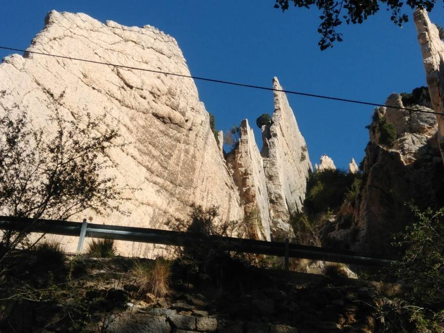 Es de destacar las importantes paredes rocosas, así como las formaciones geológicas que se observan en las rocas; motivo por el cual existe un Parque Geológico y un Centro de Interpretación de dichas formaciones. Una vez dejamos atrás el Centro y los exteriores de Aliaga no tardamos en encontrarnos con una parte relativamente llana, unas pasarelas por encima de grandes pozos y, posteriormente, nos encontramos con grandes rocas que nos conducen al comienzo de la subida que nos lleva a un collado desde el que ya se ve la Central, en donde termina el primer tramo de recorrido.