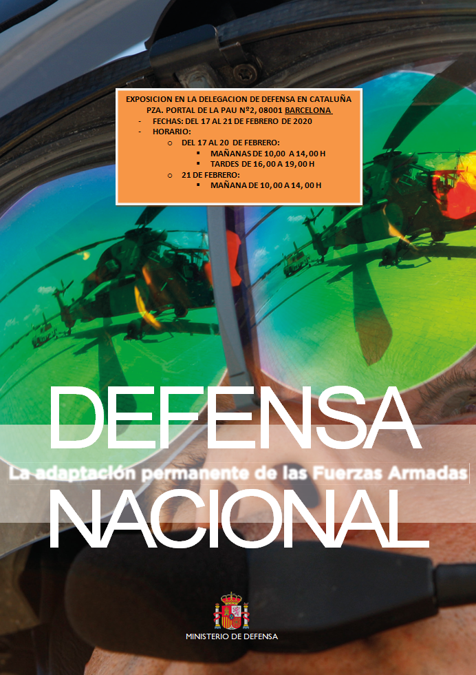 Con motivo de la EXPOSICIÓN que bajo el título “ DEFENSA NACIONAL “ se desarrollará en la Sede Principal de la DD. CATALUÑA ( PZA. PORTAL DE LA PAU Nº 2), Salón de Actos del edificio de la Comandancia Naval de Barcelona ( 2ª PLANTA ), del 17 al 21 de Febrero de 2020. Se remite cartel correspondiente a la misma, con el ruego de que se dé difusión a la misma dentro de su ámbito.