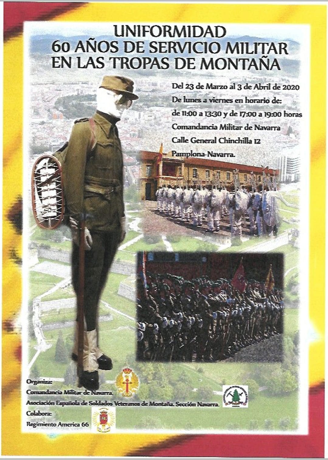 11:00 a 13:30 y de 17:00 a 19:00 horas, en la Comandancia Militar de Navarra, en la calle General Chinchilla número 12, en Pamplona, Navarra, se realizará la exposición de uniformes de las tropas de montaña durante los 60 años de servicio militar.