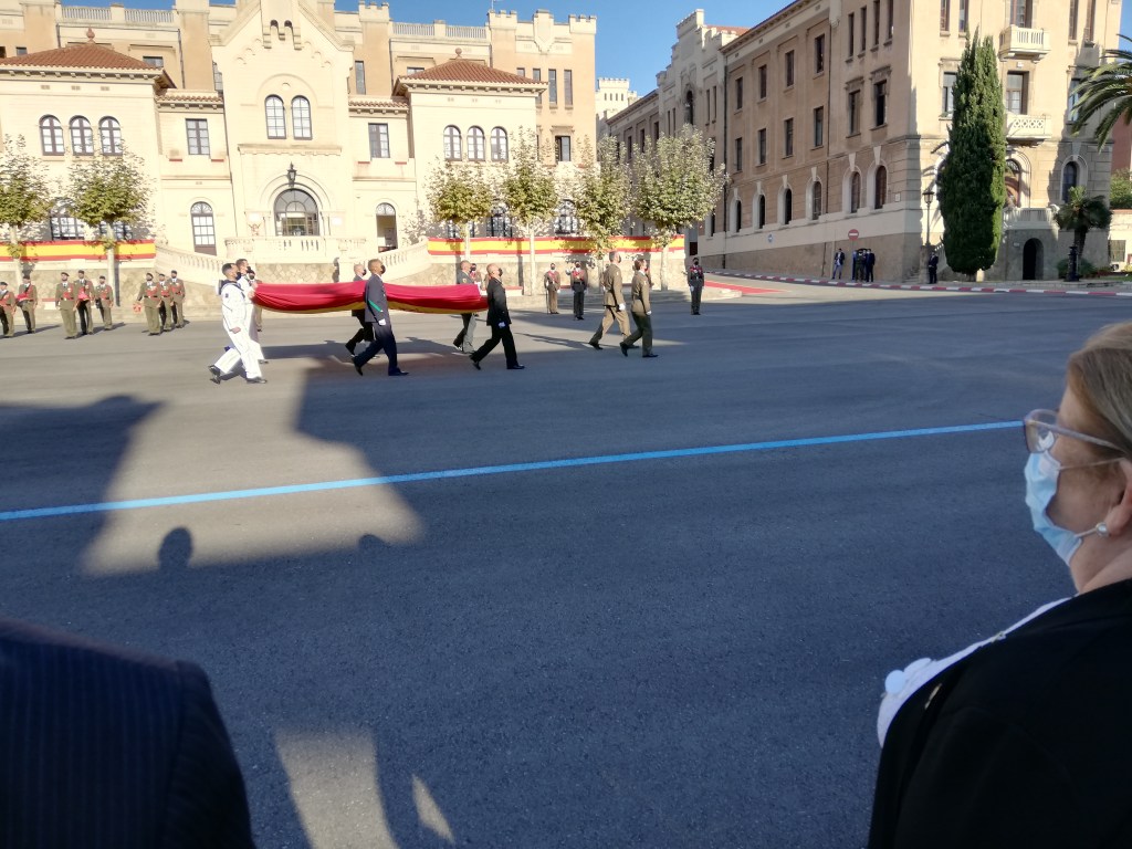 Invitados por el I.G.E. Excmo Sr. Tte. General D. Fernando Aznar Ladron de Guevara, acudimos al Acuartelamiento de El Bruch de Barcelona, el Tesorero de la Sección D. Antonio Sieso y yo. A las 9,30 h. comenzaron los actos con la Entrada de la Bandera del Regimiento al son del Himno Nacional. Posteriormente hizo su entrada el Teniente General D. Fernando Aznar Ladrón de Guevara, al son de la » Marcha de Infantes». Tras pasar revista a la tropa que estaba formada por unidades del Regimiento Barcelona y una Sección de la Guardia Civil así como una representación de marinería de la Fragata Numancia, Hizo su entrada la Bandera Nacional, que se izaría después, portada por componentes de los tres Ejércitos, Guardia Civil y Policía Nacional. Se izó solemnemente la Bandera Nacional.