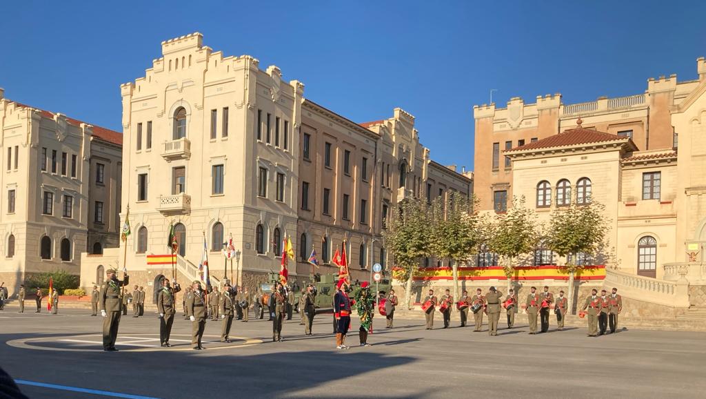 Invitados por el I.G.E. Excmo Sr. Tte. General D. Fernando Aznar Ladron de Guevara, acudimos al Acuartelamiento de El Bruch de Barcelona, el Tesorero de la Sección D. Antonio Sieso y yo. A las 9,30 h. comenzaron los actos con la Entrada de la Bandera del Regimiento al son del Himno Nacional. Posteriormente hizo su entrada el Teniente General D. Fernando Aznar Ladrón de Guevara, al son de la » Marcha de Infantes». Tras pasar revista a la tropa que estaba formada por unidades del Regimiento Barcelona y una Sección de la Guardia Civil así como una representación de marinería de la Fragata Numancia, Hizo su entrada la Bandera Nacional, que se izaría después, portada por componentes de los tres Ejércitos, Guardia Civil y Policía Nacional. Se izó solemnemente la Bandera Nacional.