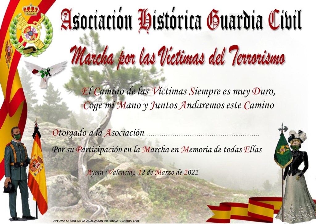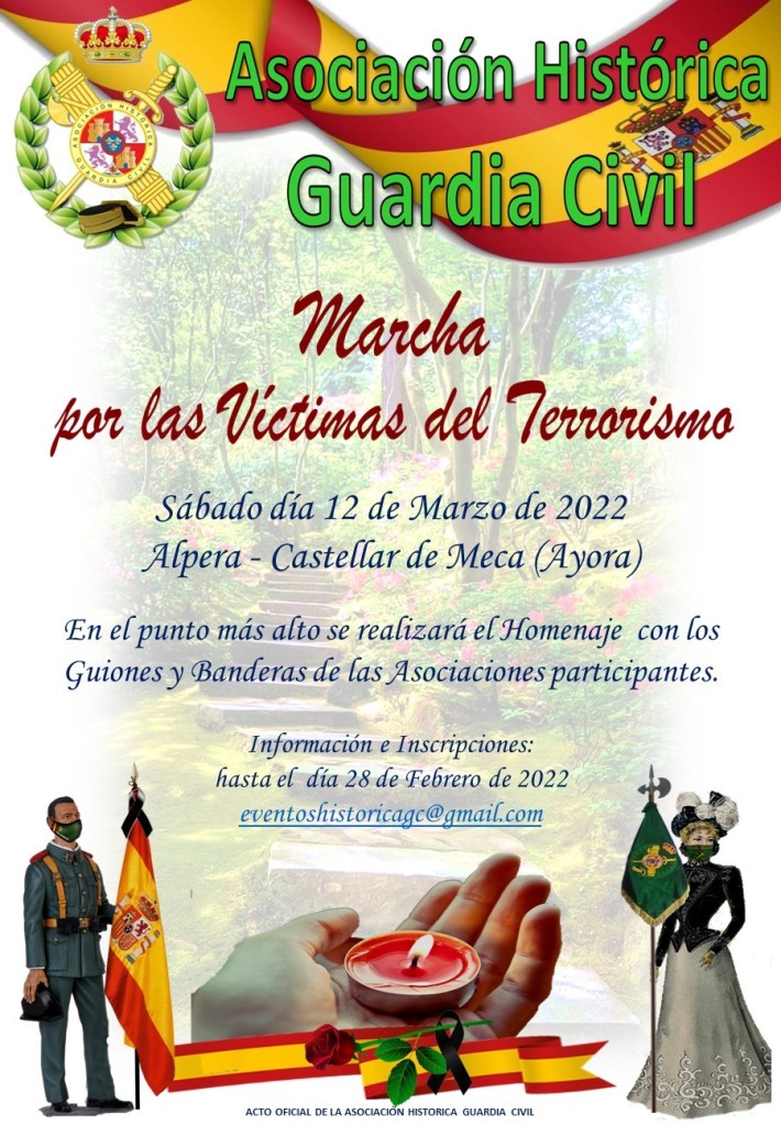 «Estimados amigos y compañeros: Hemos organizado una marcha senderista para homenajear a las Víctimas del Terrorismo con motivo del «Día Europeo de las Víctimas del Terrorismo» que es el viernes 11 de marzo y que nosotros realizaremos el sábado 12 de marzo. Nos gustaría una vez más contar con vuestra presencia y juntos en lo alto de la montaña haremos el Homenaje con los Guiones y Banderas de las asociaciones participantes. Os adjunto la información, así como los documentos que nos tenéis que enviar por correo electrónico y cuyos originales debéis traer el 12 de marzo a ALPERA:
