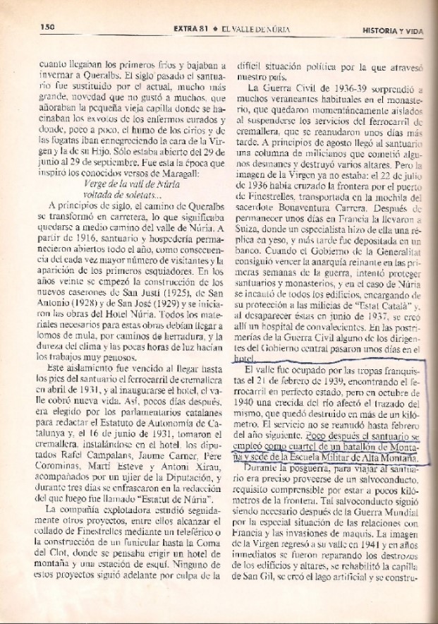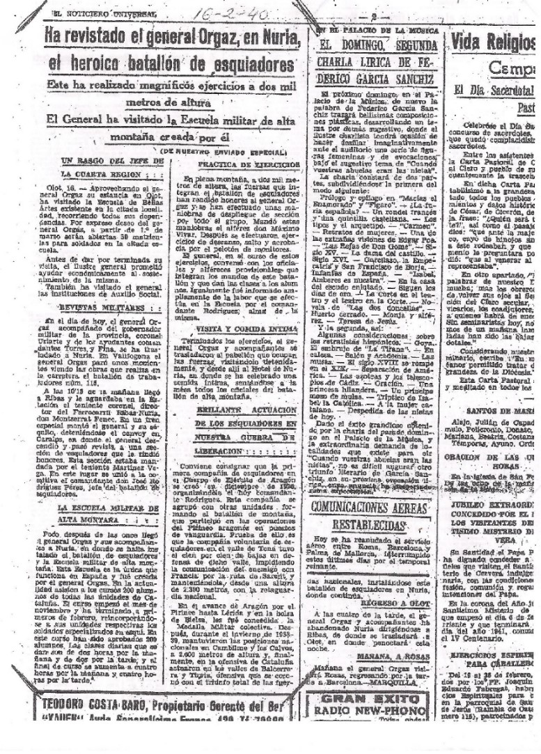 También se adjunta un documento de la revista Historia y Vida, en la cual se habla de la Escuela Militar de Alta Montaña de Nuria de aquellos años y una noticia que se publicó en “El Noticiero Universal” el 16/02/1940, importante diario vespertino de Barcelona, en él que podemos leer lo destacado en su cabecera: Ha revistado el General Orgaz, en Nuria, el heroico batallón de esquiadores. Este ha realizado magníficos ejercicios a dos mil metros de altura. El General ha visitado la Escuela de Alta Montaña creada por él.
