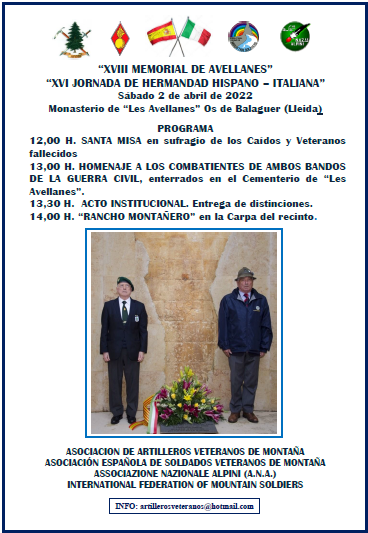 Nuestra Sección Delegada de Lérida y la Asociación de Artilleros Veteranos de Montaña nos anuncian la próxima celebración del XVIII Memorial de Avellanes, que tendrá lugar el próximo 2 de abril, si la situación epidemiológica lo permite.