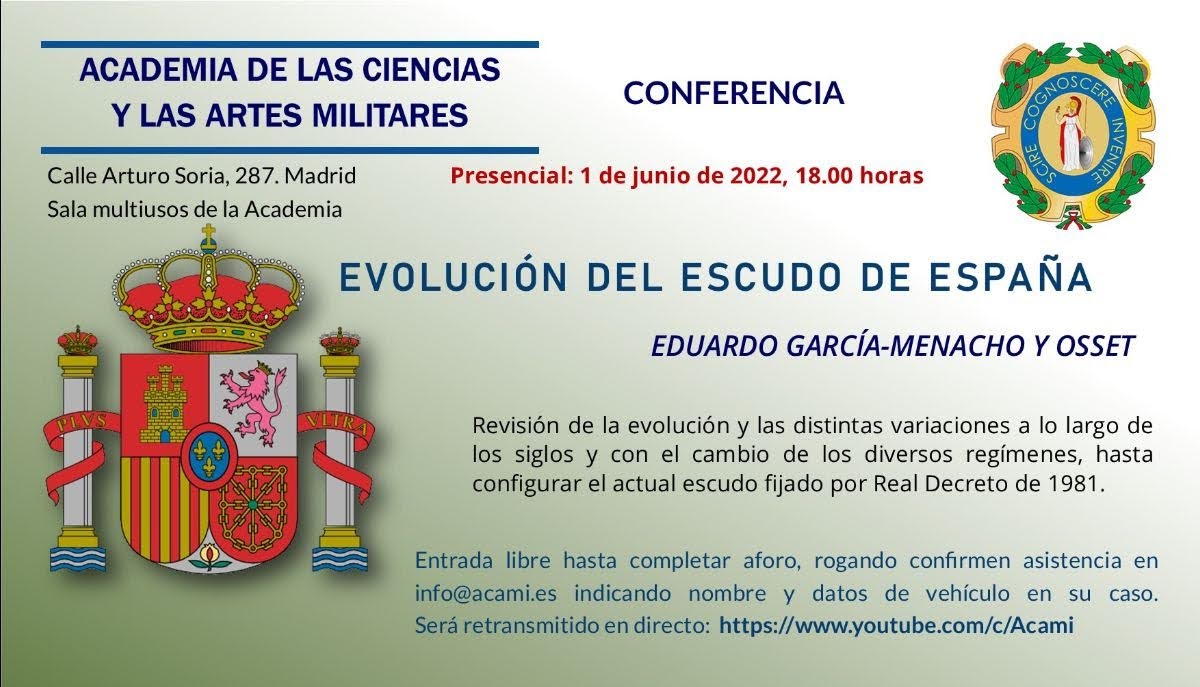 La Academia de las Ciencias y las Artes Militares ha programado una conferencia sobre la evolución del Escudo de España, pudiendo asistir presencialmente o telemáticamente de acuerdo a las indicaciones que figuran en la tarjeta de invitación que se adjunta.
