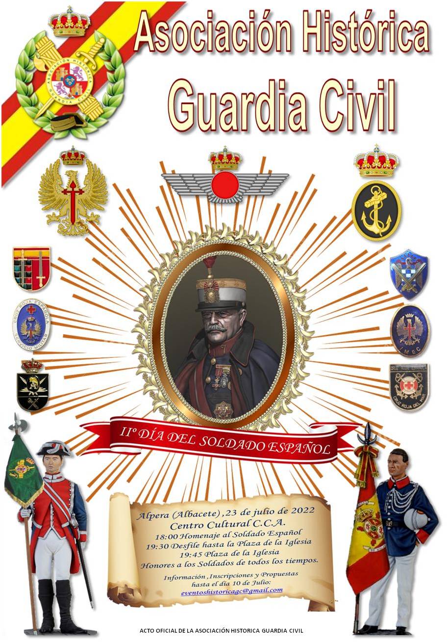 La Asociación «Histórica Guardia Civil» celebra el II Día del Soldado Español el próximo 23 de julio en la localidad de La Alpera (Albacete), invitando a participar a todos aquellos socios de nuestra Asociación que deseen asistir. Quién desee asistir debe comunicarlo a Jose Edo (jedomartin45@gmail.com), presidente de la SD de Teruel.