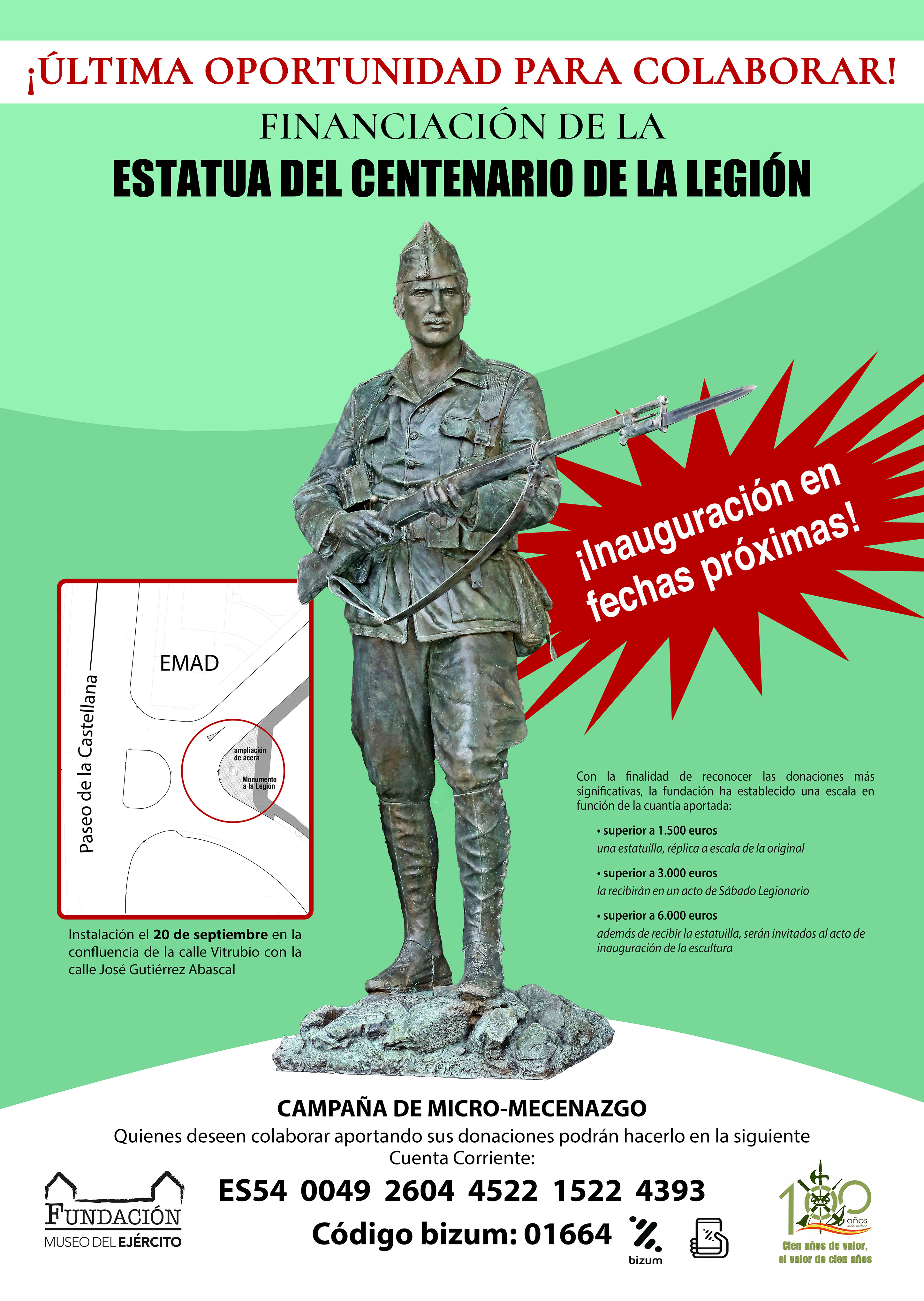 Como continuación a lo que publicamos hace algo más de un año en esta página (https://aesvm.com/2021/02/10/colecta-monumento-a-la-legion/) sobre la financiación del monumento conmemorativo del centenario de la Legión Española a erigir en Madrid, ya instalado desde el pasado 20 de septiembre en la confluencia de las calles Vitrubio y José Gutiérrez Abascal, zona este de la plaza de San Juan de la Cruz, frente al EMAD, motivo por el cual se solicita difundamos la campaña de patrocinio para completar la financiación de la escultura, obra del escultor Salvador Amaya y diseñada por el pintor Ferrer Dalmau.