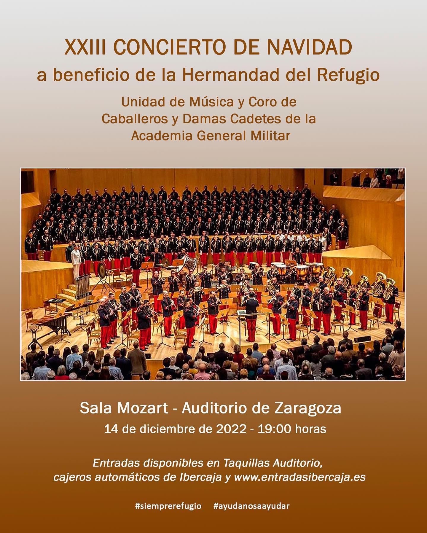 Como viene siendo ya una tradición, el próximo 14 de diciembre, a las 19:00 h, se celebrará el XXIII Concierto de Navidad a beneficio de la Hermandad del Refugio, ofrecido por la Unidad de Música y Coro de Caballeros y Damas Cadetes de la Academia General Militar en la Sala Mozart del Auditorio de Zaragoza.