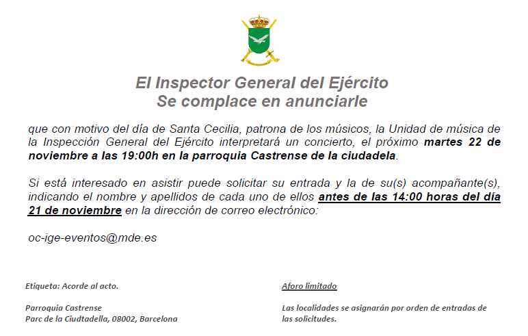 El teniente general Manuel Busque Sáez inspector general del ejército tiene el placer de invitarle al concierto, que con motivo del día de Santa Cecilia, patrona de los músicos interpretará la Unidad de música de la Inspección General del Ejército, el próximo martes 22 de noviembre a las 19:00h en la parroquia Castrense de la Ciudadela.