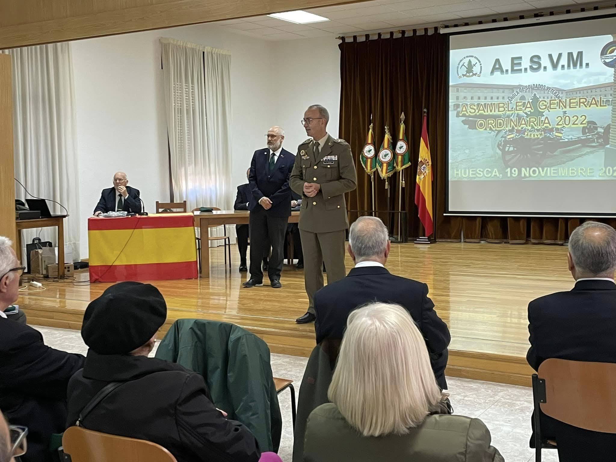 Abrió la Asamblea nuestro Presidente Nacional, para agradecer la asistencia de socios y acompañantes, así como para agradecer al Tcol. Jefe de la USAC del acuartelamiento «Sancho Ramírez», sede del CG de la División Castillejos, las facilidades dadas para realizar la celebración de la Asamblea en sus instalaciones. A continuación, se dirigió a la Asamblea el Gral. Lozano para dar cuenta de la situación actual del Mando de Tropas de Montaña desde su reciente creación, nuevamente, en 2020, asegurando la continuidad del apoyo institucional que viene proporcionando a nuestra Asociación e informando del calendario de actos y actividades en los que espera contar con la presencia de la AESVM, acabando con las novedades más destacadas para su GU en 2023, como es el despliegue de un S/GT en Malí y la celebración de una nueva prueba de Concurso de Patrullas que hará recorrer a los participantes el trayecto entre Jaca y Pamplona.
