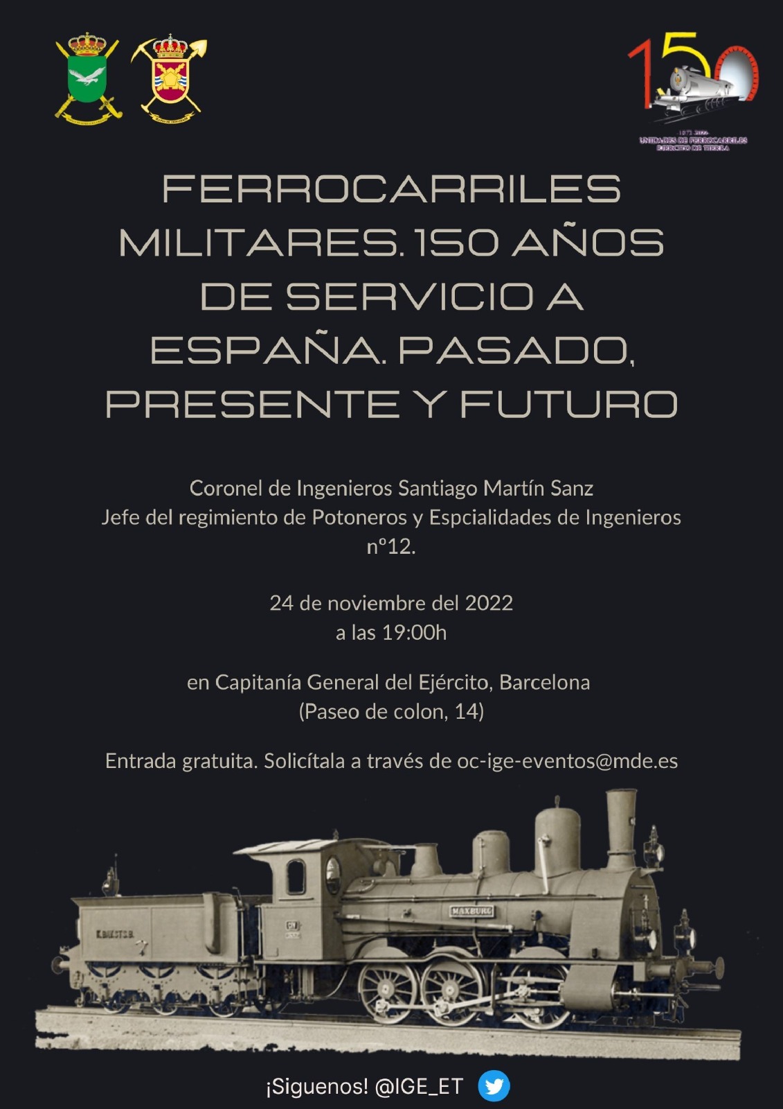 El teniente general Manuel Busquier Sáez Inspector General del Ejército tiene el placer de invitarle a la conferencia: «FERROCARRILES MILITARES, 150 Aniversario de servicio a España. Pasado, presente y futuro», el próximo miércoles 24 de noviembre a las 19:00h en el salón del trono de la Capitanía General de Barcelona.