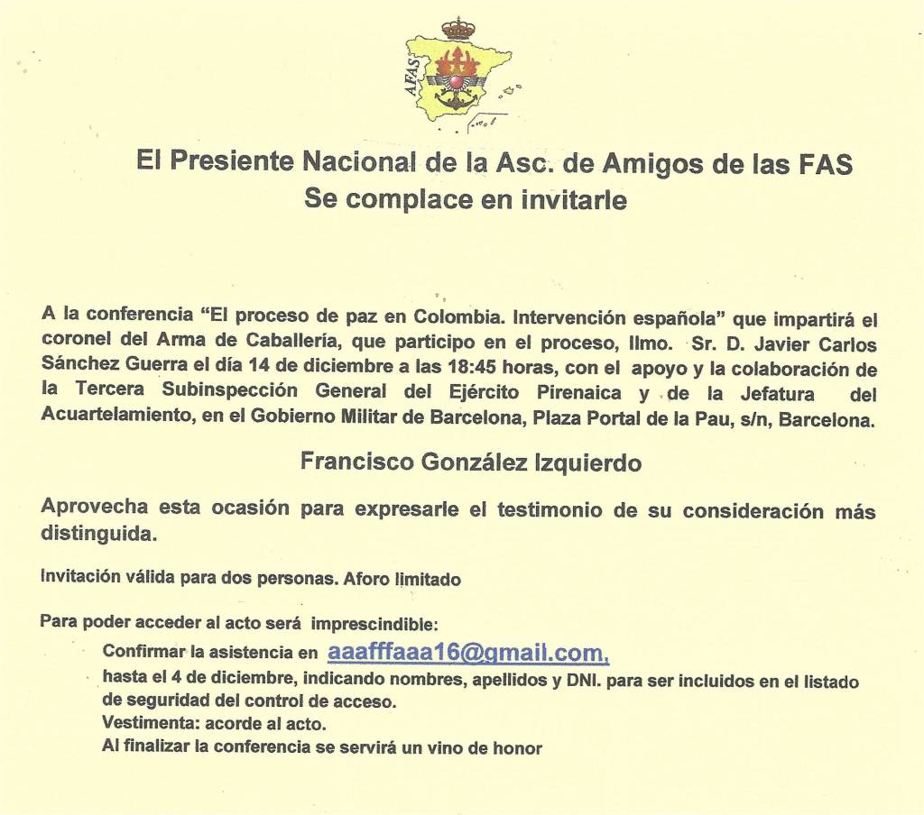 A petición de la Asociación Amigos de las Fuerzas Armadas, adjuntamos la invitación a la conferencia «EL PROCESO DE PAZ EN COLOMBIA. INTERVENCIÓN ESPAÑOLA» que se impartirá en el Palacio de Gobierno Militar el día 14 de diciembre a las 18:45 h.