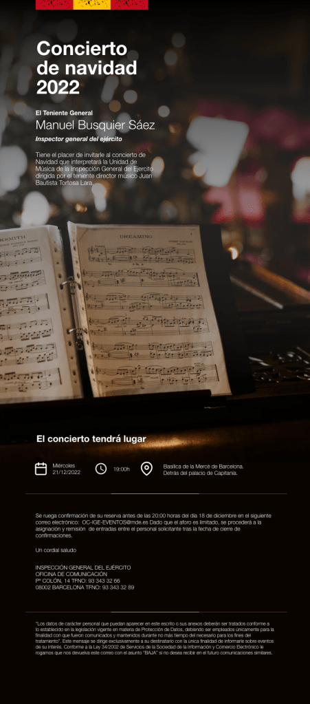 La Inspección General del Ejército no remite el cartel anunciador del tradicional concierto de Navidad, invitando a todo aquél que desee asistir hasta completar el aforo disponible.
