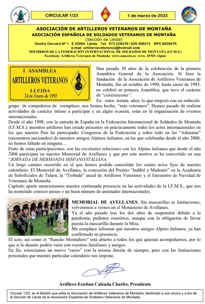 Adjuntamos la publicación de la circular 01/2023 de la Asociación de Artilleros Veteranos de Montaña, de MARZO de 2023, que publica en colaboración con la Sección Delegada de Lérida de nuestra Asociación.