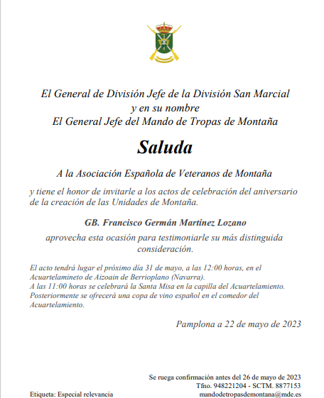 El General Jefe del Mando de Tropas de Montaña nos remite invitación para asistir al Día de las Unidades de Montaña que se celebrará el próximo día 31 de mayo en el Acuartelamiento de Anzoaín en Pamplona.