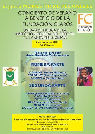 Concierto de verano a beneficio de la fundación Clarós que interpretará la Unidad de Música de la Inspección General del ejército y la cantante Lucrecia, el miércoles 7 de junio a las 20:15 horas en la iglesia del monasterio de Pedralbes. (Plaza monestir s/n Barcelona).