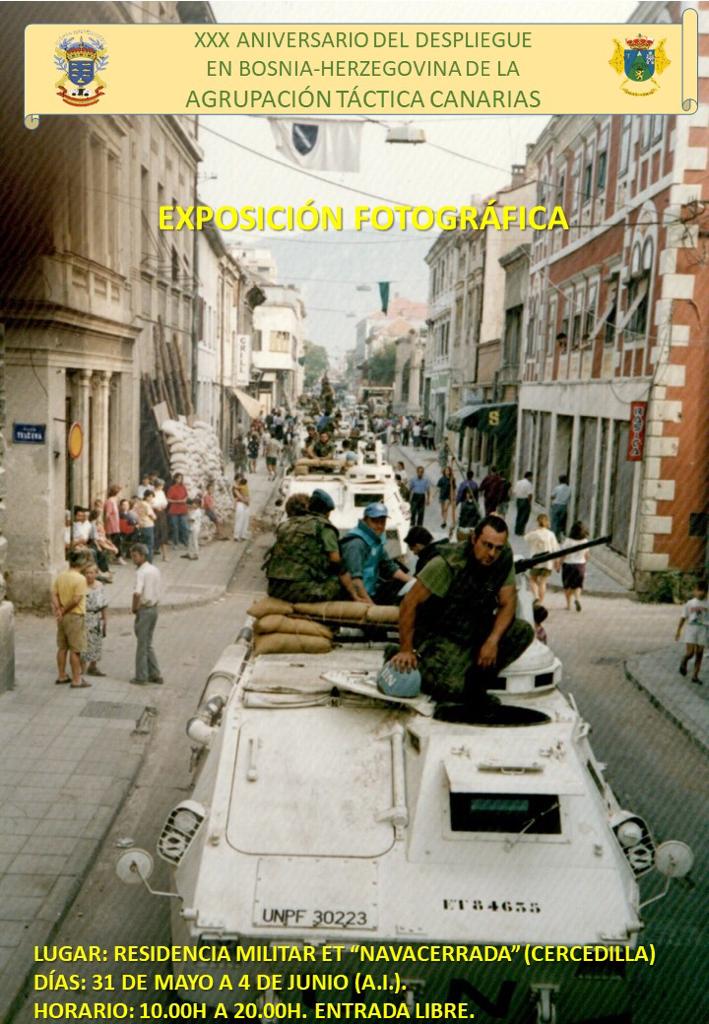 Con motivo del XXX aniversario del despliegue de la Agrupación Táctica «Canarias» en Bosnia-Herzegovina, se ha organizado una exposición fotográfica que podrá visitarse libremente en la Residencia Militar del Ejército «Navacerrada» en Cercedilla (Madrid), del 31 de mayo al 4 de junio ambos inclusive, en horario de 10:00 a 20:00 h.