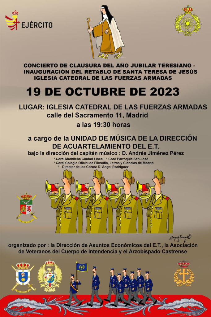 Nuestros compañeros de la Asociación de Veteranos del Cuerpo de Intendencia en colaboración con la Dirección de Asuntos Económicos del ET y el Arzobispado Castrense han organizado este acto cultural, coincidente con la clausura del Año Jubilar Teresiano y la inauguración del Retablo de Santa Teresa de Jesús en la Iglesia Catedral Castrense de Madrid.