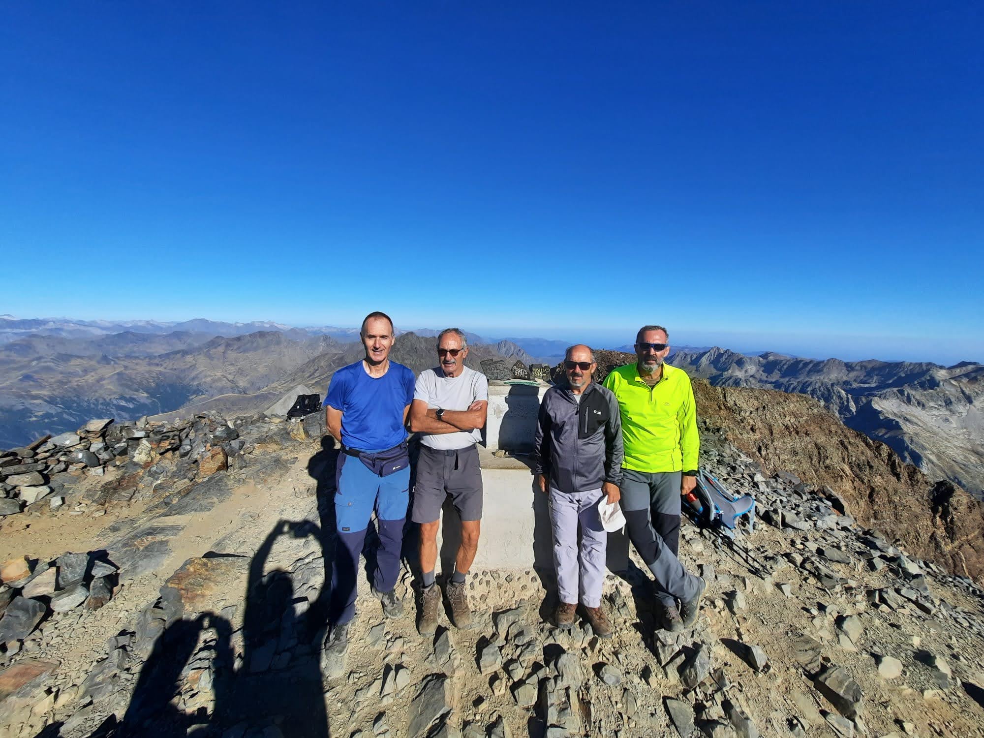 El pasado día 10 cuatro componentes de la Sección de Huesca realizamos la ascensión al Pico Posets de 3375 metros. El día anterior nos desplazamos desde Huesca hasta el aparcamiento de Espigantosa en Eriste, desde allí y en un poco más de una hora y cuarto alcanzamos el Refugio Ángel Orús, en el cual pernoctamos. Con las primeras luces del día, iniciamos la ascensión al Posets por la ruta clásica de la Canal Fonda, sin querer batir ningún récord montañero, en tres horas habíamos alcanzado la cima, después de contemplar y disfrutar del paisaje iniciamos el regreso, nos esperaban mil ochocientos metros de desnivel de bajada, pensando en nuestras veteranas rodillas, chino chano llegamos al Refugio en el que realizamos un pequeño alto técnico para hidratarnos, después del cual retomamos la marcha hasta el lugar en dónde habíamos dejado el coche. Queremos compartir con todos vosotros estas fotografías para que también disfrutéis de nuestro Pirineo.