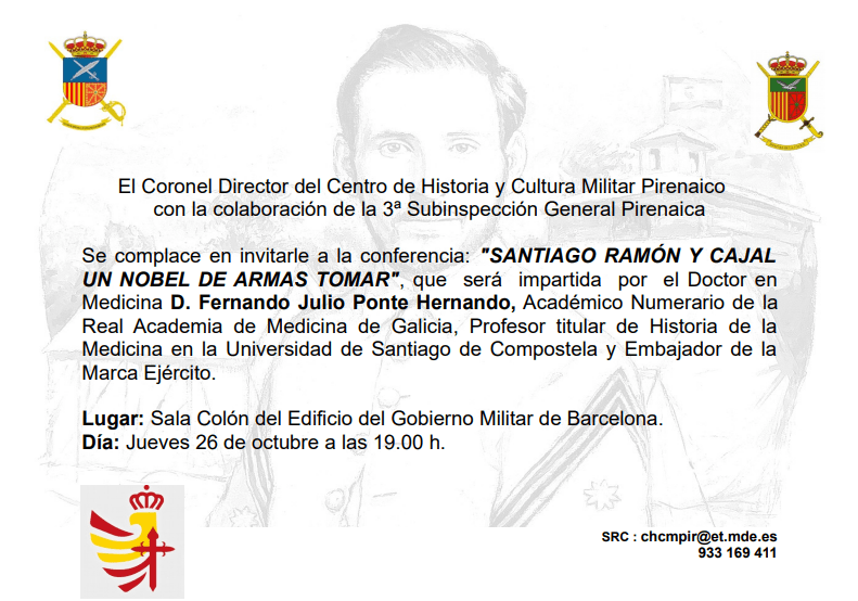 Por un error del servidor algunos correos no se han remitido, por lo que nos complace adjuntarles la invitación para la conferencia que con el título: «SANTIAGO RAMÓN Y CAJAL UN NOBEL DE ARMAS TOMAR», será impartida por el Doctor en Medicina D. Fernando Julio Ponte Hernando, el jueves 26 de octubre a las 19.00 en el Salón Colón del Gobierno Militar de Barcelona.