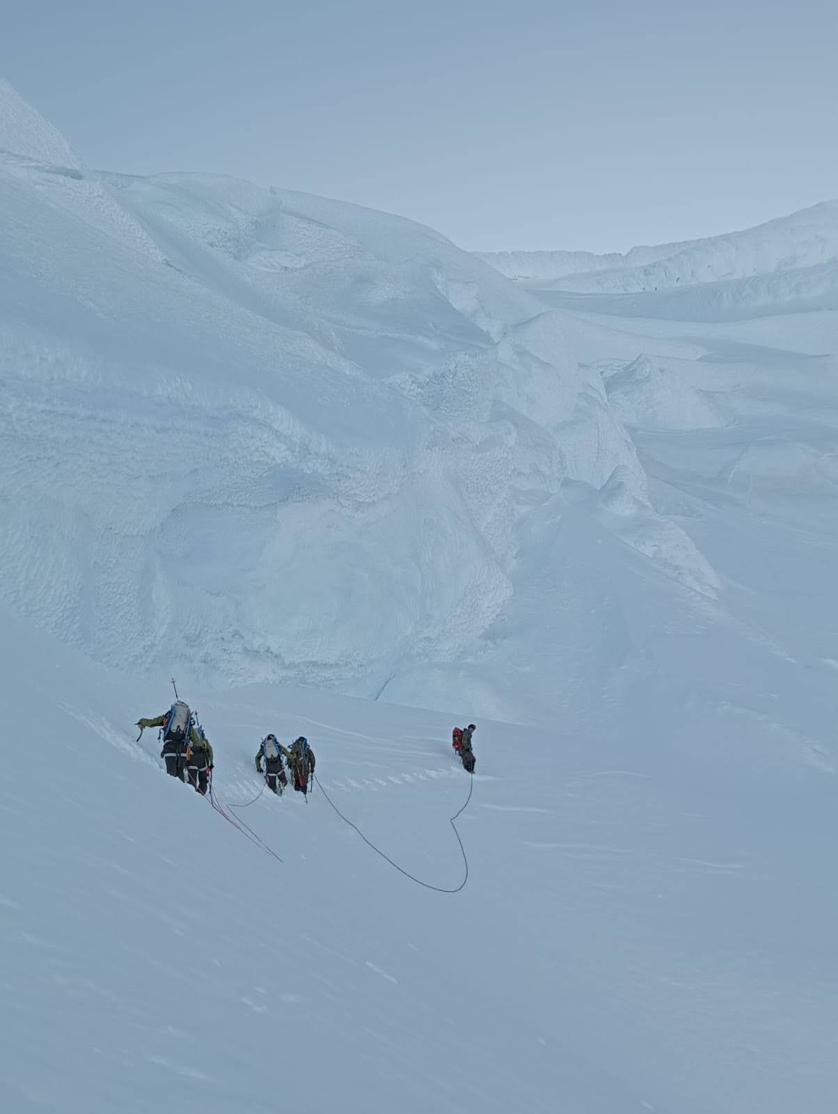Entramos diez personas y conseguimos que todas ellas no solo hicieran cima, sino que regresáramos sanos y salvos, porque fue un día complicado. Hubo que superar un desnivel de 2.100 metros y posteriormente descenderlo haciendo frente a importantes peligros objetivos. En total el día de cima nos llevó diecisiete horas de trabajo ininterrumpido. En la ascensión, tuvimos que superar pendientes con un desnivel del 60 y 70%, zonas de grietas y paredes de hielo, pero lo más complicado fue el descenso, ya que los puentes de nieve estaban inestables, debido a calor, y los tornillos y anclajes tampoco se podían utilizar porque no se sujetaban en el hielo por el mismo motivo. Además, la exposición a sufrir una avalancha de nieve húmeda fue alta.