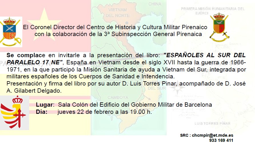 Presentación y firma del libro por su autor D. Luis Torres Pinar, acompañado del Alférez de Navío (RV) D. José A. Gilabert Delgado, en la sala Colón en el edificio del Gobierno Militar de Barcelona ,el jueves 22 de febrero a las 19.00 h.