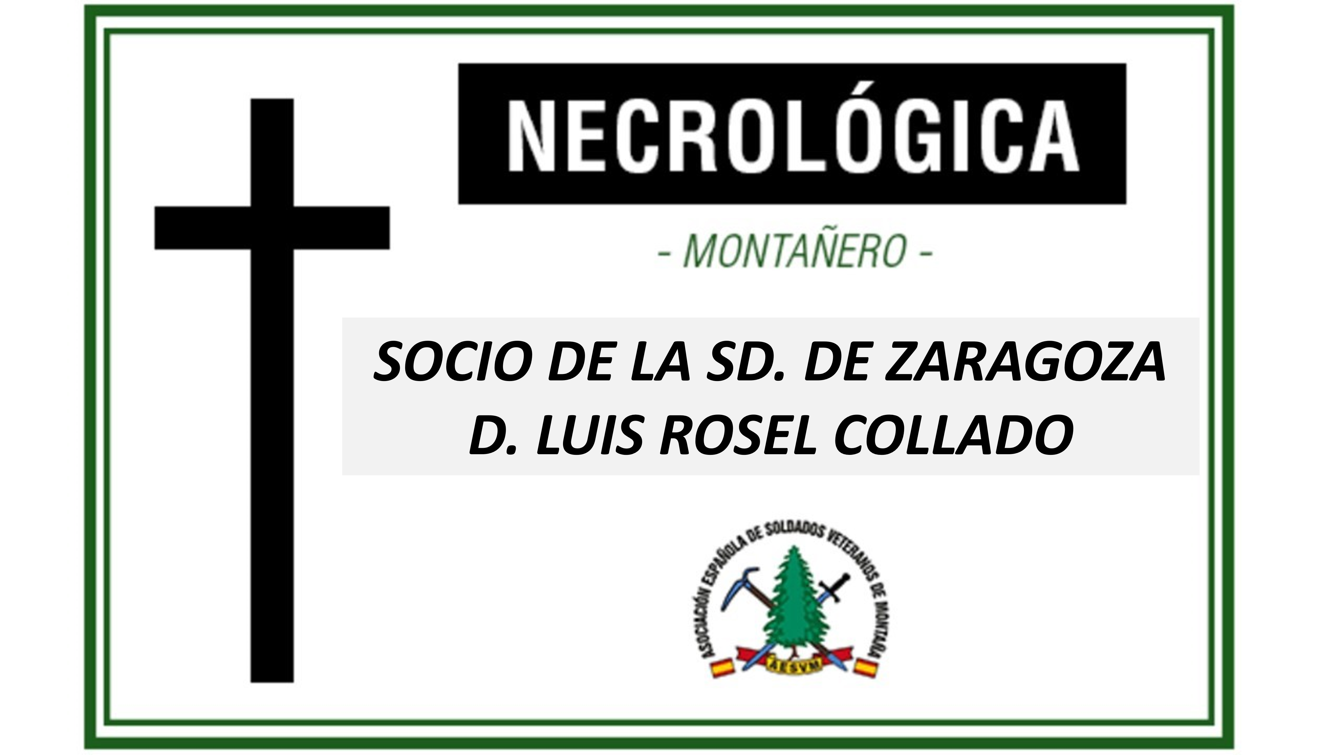 En el día de hoy, 19 de febrero de 2024, nos ha dejado, tras una larga enfermedad, nuestro amigo y compañero de la Sección Delegada de Zaragoza D. Luis Rosel Collado, perteneciente a nuestra Asociación desde el mes de mayo de 2012. Desde aquél momento y hasta que la enfermedad le alejó de la primera línea, participó y colaboró activamente en cuantas actividades se llevaron a cabo en su SD de Zaragoza, destacando por su afabilidad y disponibilidad permanente.