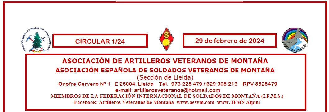 Adjuntamos la publicación de la circular 01/2024 de la Asociación de Artilleros Veteranos de Montaña, de FEBRERO de 2024, que publica en colaboración con la Sección Delegada de Lérida de nuestra Asociación.