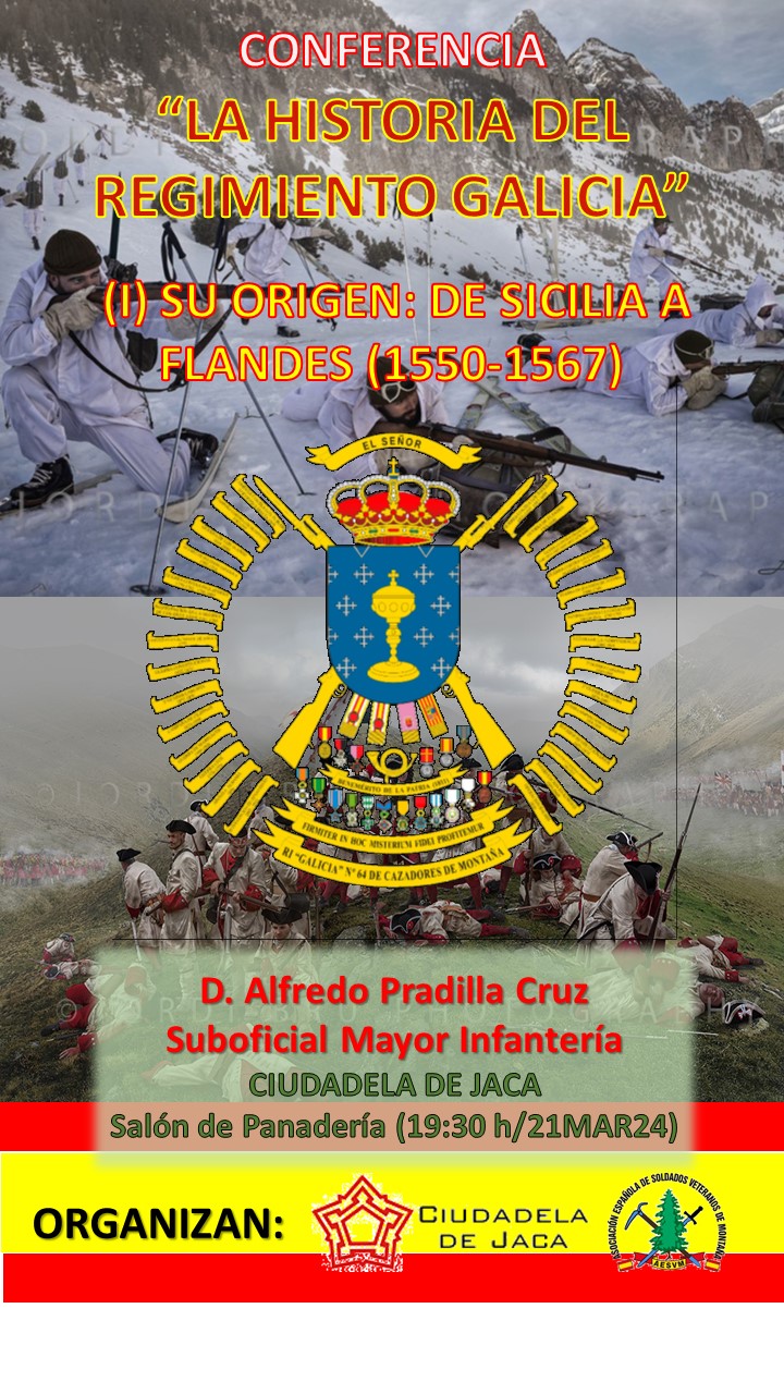 El próximo jueves, 21 de marzo a las 19:30 h, en el Salón de Panadería de la Ciudadela de Jaca, la Sección Delegada de Jaca de nuestra Asociación, en colaboración con el Consorcio del Castillo de San Pedro de Jaca, dará comienzo a un ciclo de conferencias sobre la Historia del Regimiento Galicia-64, con sede en esta localidad oscense desde hace más de un siglo, impartidas por el Suboficial Mayor de Infantería, D. ALFREDO PRADILLA, quién lleva ya bastantes años dedicado a estudiar la interesante historia de la Unidad, en la que ha prestado sus servicios durante buena parte de su vida militar en activo.
