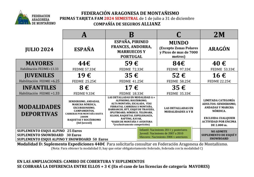 Se han introducido en la plataforma de gestión los precios válidos a partir del 1 de julio, los cuales adjuntamos. Esto hace que a la hora de tramitar la tarjeta haya que estar atento a la fecha de federación para poder formalizar correctamente la opción elegida por el socio: fecha de junio o fecha de julio. Para todos los que organizáis campamentos de verano puede ser interesante al tramitar las tarjetas de chicos y chicas.