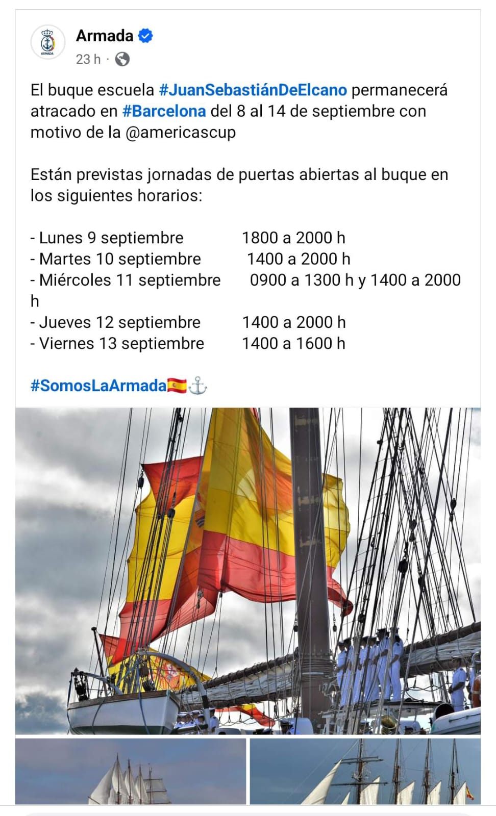 De l 8 al 14 de septiembre se encontrará atracado en el puerto de Barcelona el buque escuela de Armada Española «Juan Sebastián Elcano», que podrá visitarse en las jornadas de puertas abiertas que se celebrarán los días 9 al 13 de septiembre en el horario que se indica en el poster anunciador.