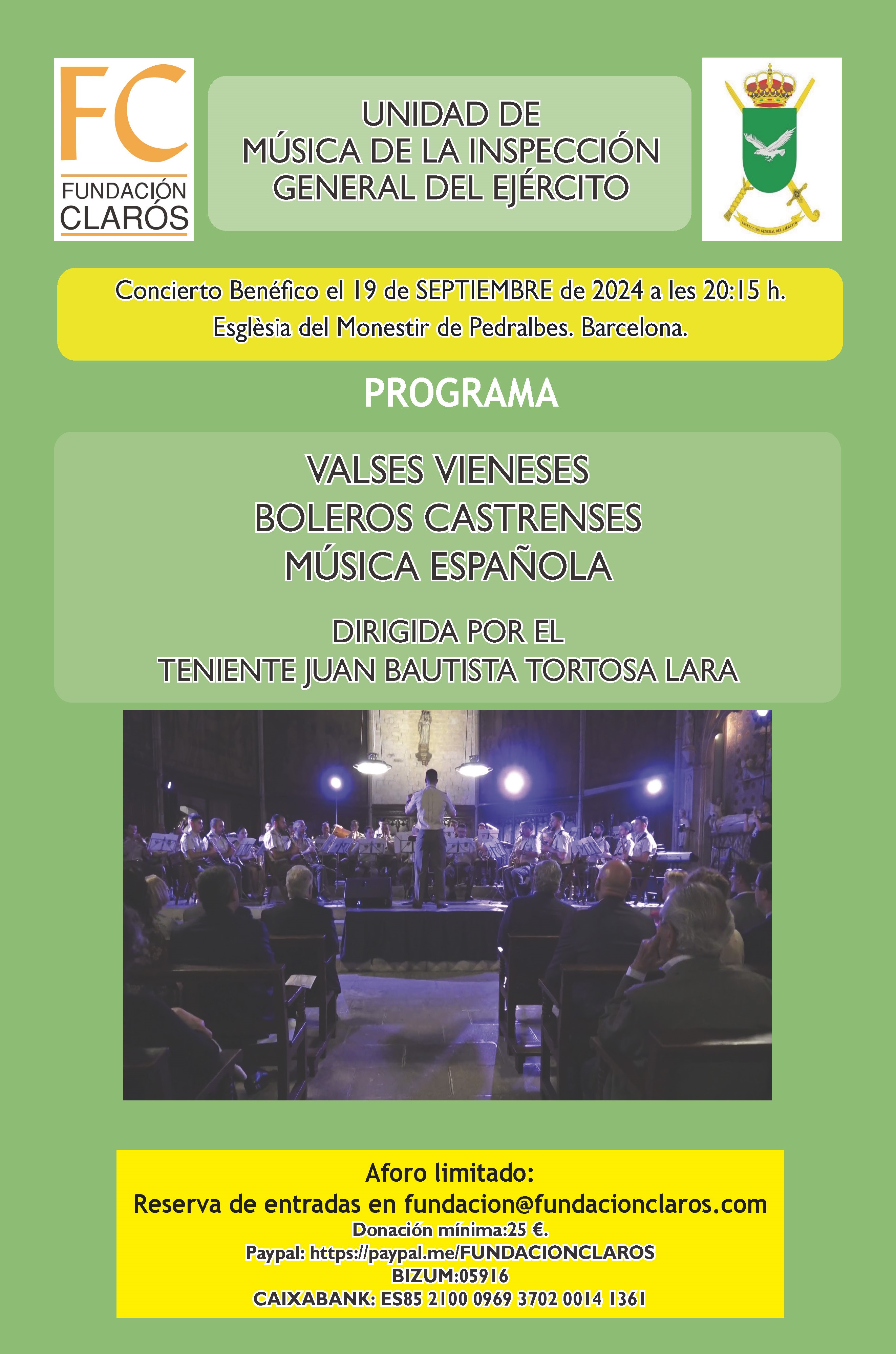 Por ello, el próximo jueves 19 de septiembre de 2024 a las 20:15 en la iglesia del emblemático Monasterio de Pedralbes en Barcelona, la Unidad de Música de la Inspección General del Ejército interpretará un concierto que será dirigido por el Teniente director Músico Juan Bautista Tortosa Lara, en el que se interpretarán valses, boleros y música española.