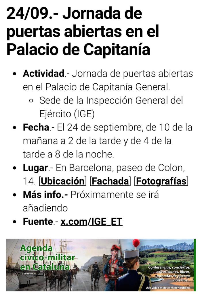 El próximo 24 de septiembre la Inspección General del Ejército celebrará una Jornada de Puertas Abiertas de acuerdo a las condiciones que se indican en el cartel anunciador de la misma.