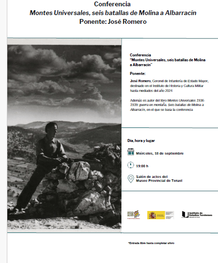 El próximo 18 de septiembre se impartirá la conferencia “Montes Universales, seis batallas de Molinaa Albarracín” de D. José Romero, Coronel de Infantería de Estado Mayor, destinado en el Instituto de Historia y Cultura Militar hasta mediados del año 2024.