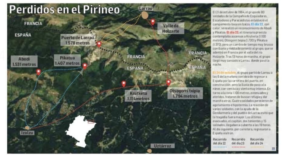 Dos supervivientes de la tragedia, el general retirado Luis Palacios Zuasti, entonces teniente, y Fernando Saiz Padrones, natural de Burgos pero vecino de Estella desde hace décadas, recordaban con mucha emoción aquella marcha de los días 23 y 24 de octubre de 1964. “Fueron dos días muy intensos y muy duros, vivir aquello nos marcó profundamente y para siempre”, admite Palacios. “Aprendimos la dureza de la montaña, donde fuimos llevados a una situación límite en la que prácticamente se anula al hombre. Se produjo un cambio brusco y absolutamente imprevisible de la situación en una misma zona y en 24 horas. De pronto, la lluvia fue intensa, y dio paso a una niebla muy tupida, sin que pudiéramos ver a muy escasos metros de nosotros. Avanzábamos casi a tientas. Tras 13 horas de marcha, empapados, muy fatigados, por la noche pudimos descansar muy poco y tras un desayuno muy precario, a las 6 de la mañana partimos hacia España por el paso del puerto de Larrau. La lluvia se volvió nieve, que con la caída de temperatura se hizo ventisca. La cantidad de nieve era enorme. La progresión se hizo imposible. In detentamos regresar a unas chabolas. La situación fue límite. Yo me encontraba muy fatigado, pero aún algo de fuerza me permitió cargar a algún compañero. Fueron momentos muy duros, hubo mucha dispersión”.