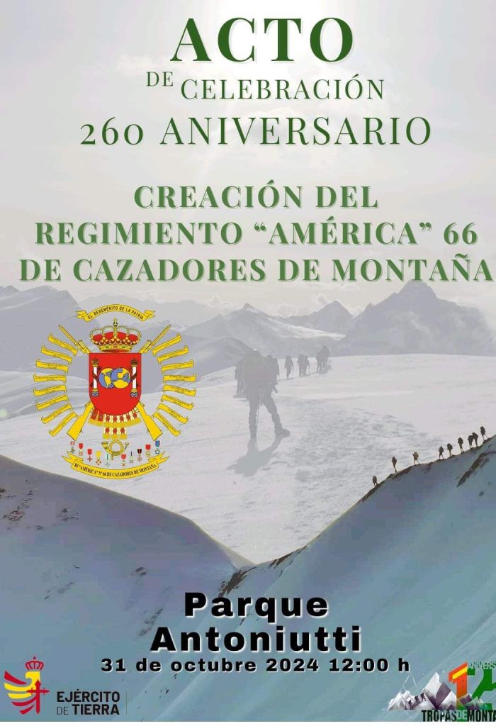 El Regimiento de Infantería América 66, de Cazadores de Montaña, fue creado como unidad expedicionaria en 1764 con el fin de reforzar la guarnición de Nueva España y servir de «norma y regla» a las futuras unidades que se pensaban crear en aquel Virreinato, arribando a Veracruz el 2 de noviembre, por lo que este jueves celebrará orgulloso, Con un acto en Pamplona, su bicentésimo sexagésimo aniversario, con un historial forjado en más de 5.000 acciones de guerra en cuatro continentes, siendo tan destacada su actuación en la Primera Guerra Carlista que le fue concedido el título de Benemérito de la Patria.