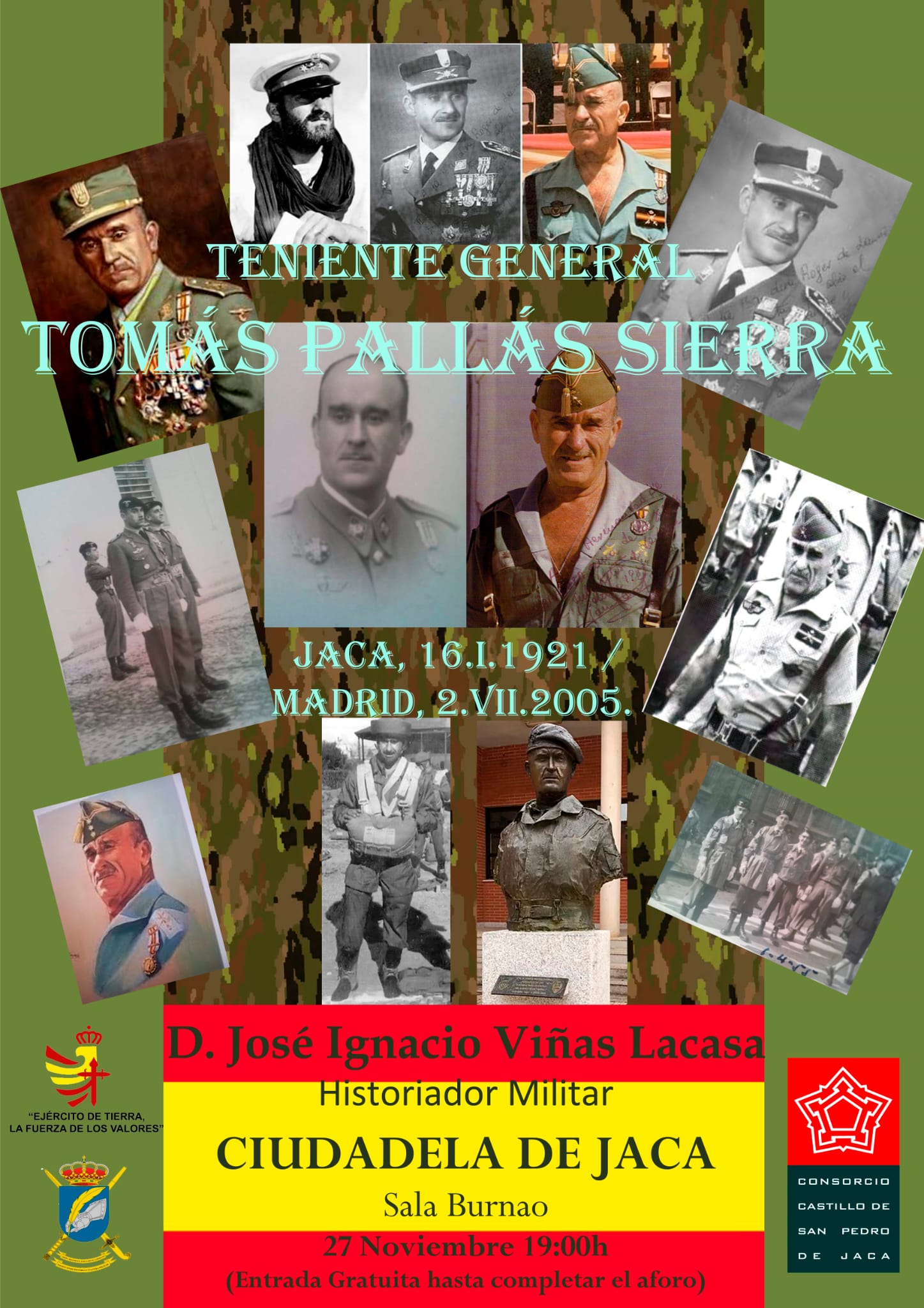 El Consorcio del Castillo de San Pedro ha programado para el próximo día 27 de noviembre un conferencia sobre un personaje muy querido para todos los montañeros militares, se trata del Teniente General D. Tomás Pallás Sierra, que tendrá lugar en la Sala Burnao de la Ciudadela de Jaca a las 19:00 h.
