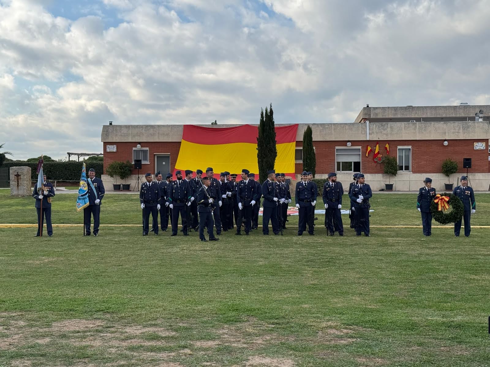 La inclemencia momentánea, por una ligera lluvia, ha motivado que el Coronel Pastor haya pospuesto sus palabras para antes del vino español celebrado en el local social habilitado para ello, estando todos ya a cubierto. Un brindis por el primer soldado y aviador de España, SM el Rey Felipe VI, ha precedido el inicio del ágape.