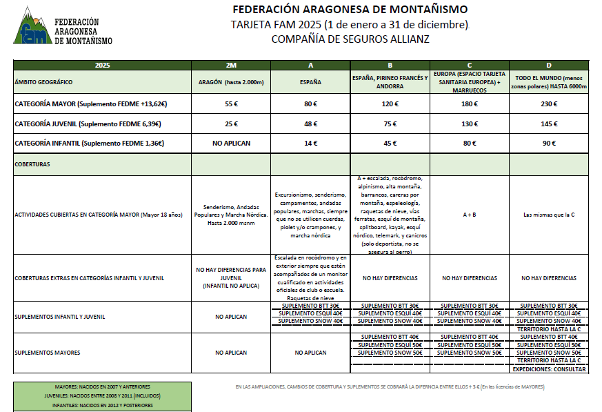 La Federación Aragonesa de Montañismo (FAM) nos remite la siguiente información en relación a las tarjetas federativas para el año 2025, cuya solicitud podrá hacerse a partir del próximo 17 de diciembre, debiendo los interesados en federarse indicar la modalidad por la que opta, comunicarlo al correo clubaesveteranosdemontana@gmail.com e ingresar, mediante transferencia bancaria, la cuota correspondiente en la CC de la Asociación que se comunicará particularmente a cada socio que solicite ser federado, mediante correo electrónico o whatsapp: