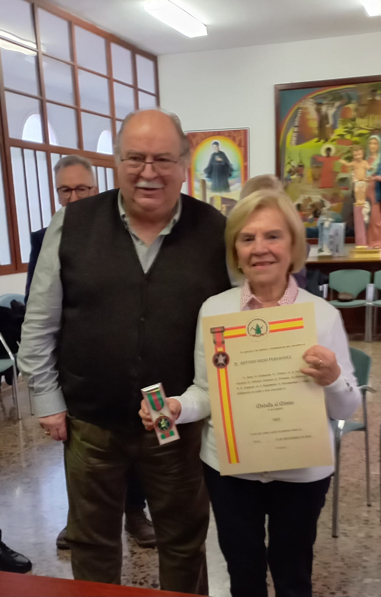 Después tuvo lugar el emotivo Acto de Entrega de la Medalla de Oro de la AESVM, otorgada a Titulo Póstumo a D. Antonio Sieso Fernández. La recogió su Viuda, Dña. Marina Maqueda, también socia de la Sección.