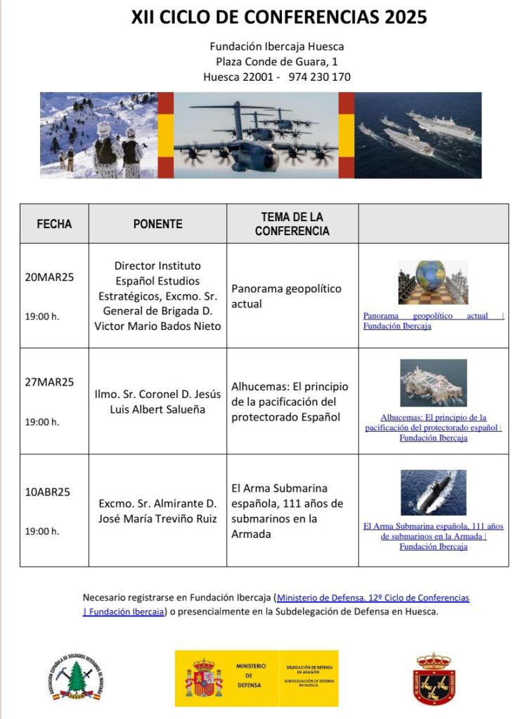 Adjunto se remite información relativa al XII Ciclo de Conferencias organizado por la Subdelegación de Defensa en Huesca, la Real Hermandad de Veteranos de las Fuerzas Armadas y Guardia Civil de Huesca y la Asociación Española de Soldados Veteranos de Montaña (Sección Delegada de Huesca).