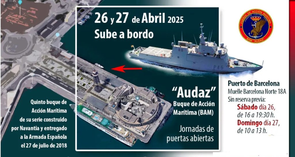 Desde la Comandancia Naval de Barcelona nos comunican que el próximo fin de semana estará el Patrullero “Audaz” (P-45) atracado en el Puerto de Barcelona, y se podrá visitar.