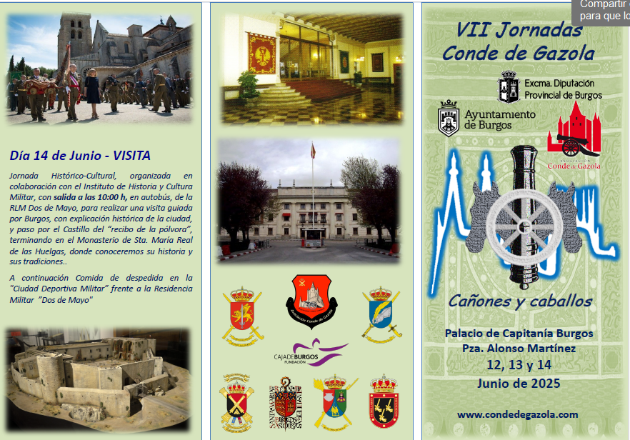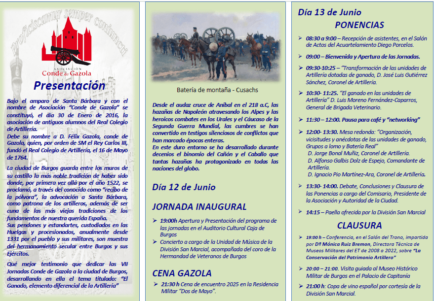 Nuestro presidente ha recibido una invitación para asistir a las VII Jornadas Artilleras organizadas por la Asociación «Conde de Gazola» y que comparte con todos nosotros por si alguno quisiera asistir a las mismas, debiendo comunicarlo antes del 4 de junio en el correo electrónico siguiente: secretario@condedegazola.org