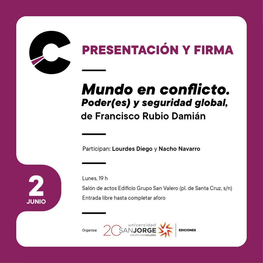 El lunes 2 de junio a las 19:00 h, en el salón de actos del Edificio Grupo San Valero, Ediciones Universidad San Jorge presenta una nueva publicación de la colección USJ Sénior, Mundo en conflicto. Poder(es) y seguridad global, de Francisco Rubio Damián, socio de nuestra Asociación.