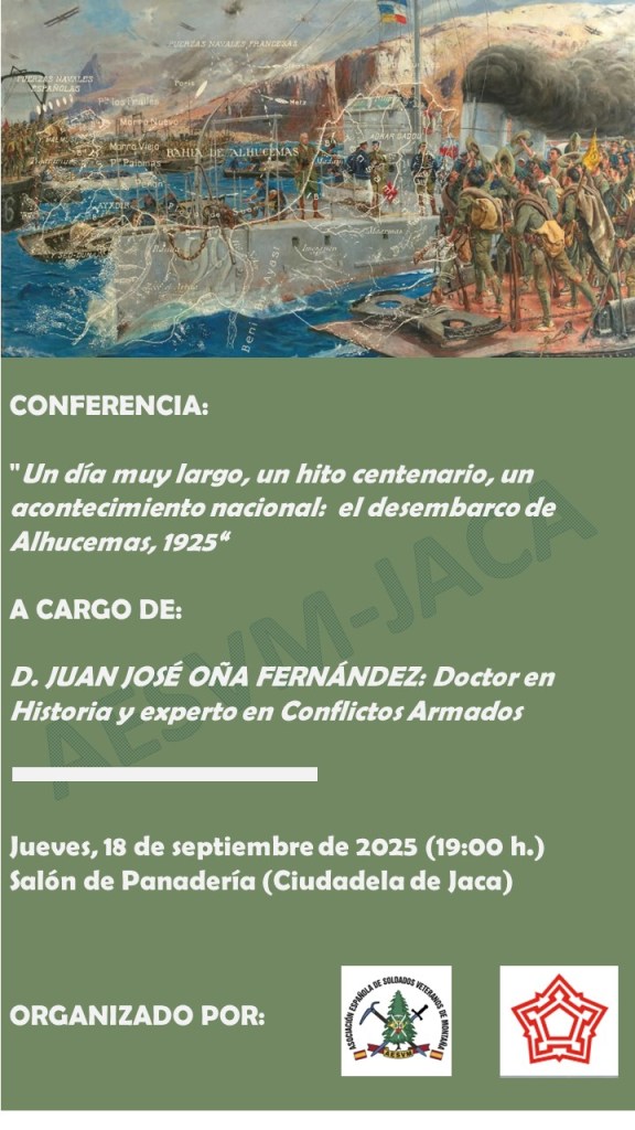 Por dicho motivo nuestra Sección Delegada de Jaca/Sabiñánigo ha programado una conferencia sobre el Desembarco de Alhucemas para el próximo día 18 de septiembre, a las 19 h, en la Ciudadela de Jaca e impartida por el Doctor en Historia y experto en Conflictos Armados (Capitán de Caballería retirado), D. Juan José Oña Fernández.