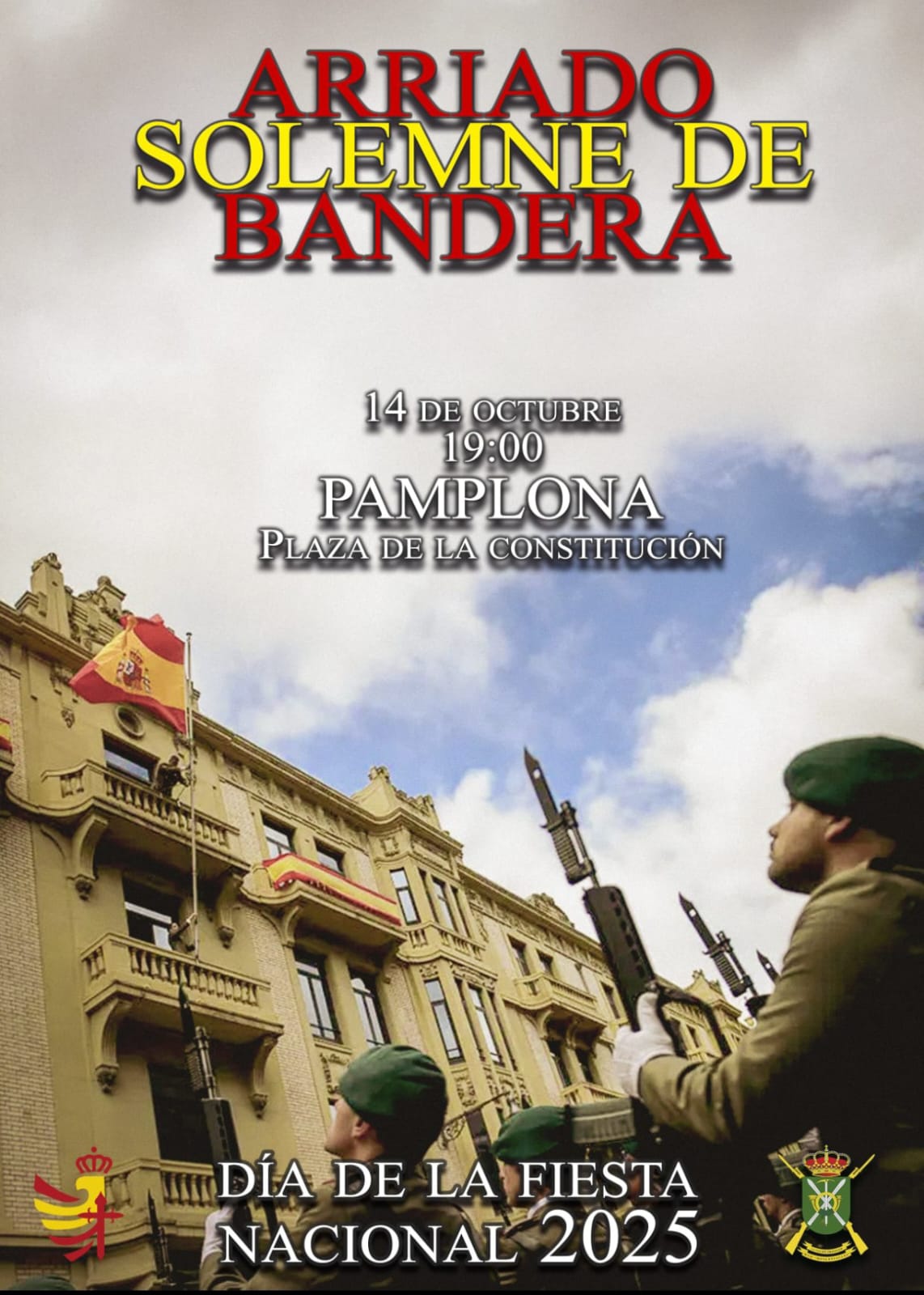 El martes 14, organizado por el Mando de Tropas de Montaña con motivo del día de la Fiesta Nacional, tuvo lugar en la plaza de la Constitución de Pamplona un solemne arriado de bandera.